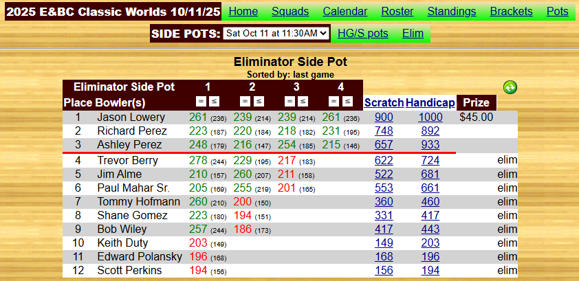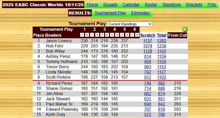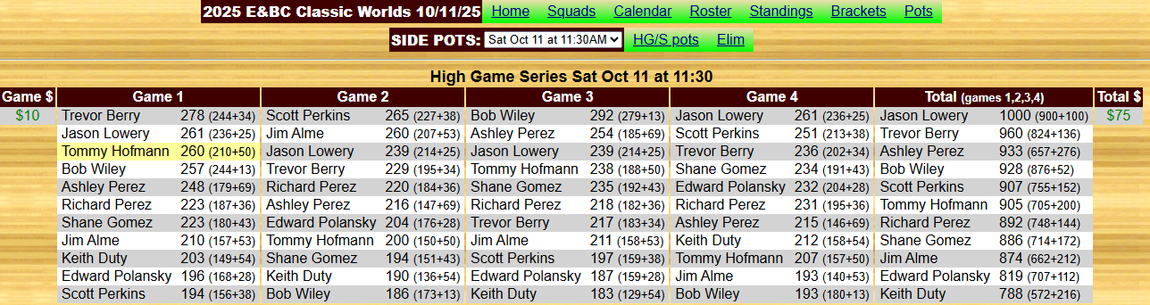 Saturday October 11h we only had 15 bowlers for this event. The bowlers bowled on the Sapphire E&BC Tournaments oil pattern. This pattern was a higher scoring pace pattern. Even though we only had 15 bowlers we stuck to the announced format of bowling 4 games with a cut to the top half, followed by a one-game elimination title game. Our victor today was first time title winner, Jason Lowery who had a bowled great all day to take the title. We cashed three spots with Rob Fehr taking 2nd place, and Bob Wiley taking 3rd. Overall condition of the lanes was very good. As always, we would like to thank the crew at Bowlero Union Hills who work as hard as they do to make sure these events run without a hitch. We would also like to thank you to all who came out in support of this event. To be eligible to bowl the year-end event you will need to bowl at least 2 events prior. Our next event will be November 22nd, 2025. You can contact us at ebc_tournaments@yahoo.com for any additional information. We currently have holding over $500 added prize money for the year-end event with more being added each tournament. Plus, we have an additional $265 held for the progressive pot. Each event we anticipate these tournaments to grow.
